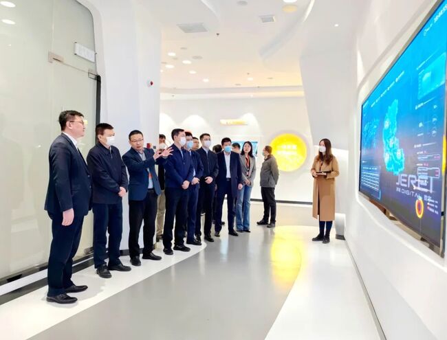 2023年3月17日,中國石油天然氣集團有限公司總經理助理姜力孚、工程和物裝管理部副總經理田鵬等領導一行在杰瑞集團董事長李慧濤的陪同下蒞臨捷瑞數字參觀交流,捷瑞數字副總裁安士才、OED事業部總經理孫媛媛熱情接待并陪同參觀。