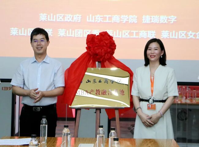 ▲山東工商學(xué)院工商管理學(xué)院院長(zhǎng)苗成林與牟文青總裁為“MBA產(chǎn)教融合基地”揭牌