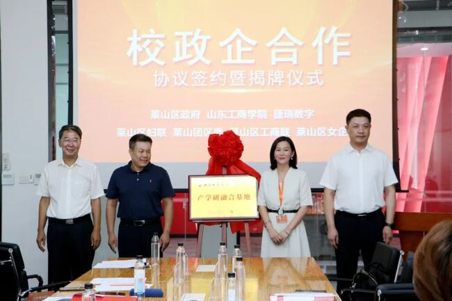 簽約現(xiàn)場(chǎng),山東工商學(xué)院科研處處長(zhǎng)李希亮與牟文青總裁為“產(chǎn)學(xué)研融合基地”揭牌,山東工商學(xué)院工商管理學(xué)院院長(zhǎng)苗成林與牟文青總裁為“MBA產(chǎn)教融合基地”揭牌,萊山區(qū)委副書記臧雷,山東工商學(xué)院副校長(zhǎng)徐世艾等領(lǐng)導(dǎo)共同見證,并對(duì)此次校企合作報(bào)以熱烈的祝賀,希望雙方加快合作步伐,謀求共同發(fā)展,充分發(fā)揮自身優(yōu)勢(shì)和產(chǎn)業(yè)鏈專業(yè)化優(yōu)勢(shì),以人才培養(yǎng)推動(dòng)產(chǎn)業(yè)高質(zhì)量發(fā)展,為煙臺(tái)沖刺萬(wàn)億城市蓄勢(shì)聚力。