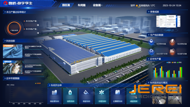 魏橋數(shù)字孿生綠色智能印染工廠通過ERP采集設(shè)備生產(chǎn)數(shù)據(jù),將接口數(shù)據(jù)與大屏、模型場景結(jié)合,通過對數(shù)據(jù)的存儲、清洗、分析、可視化應(yīng)用,生成了生產(chǎn)園區(qū)總覽、車間生產(chǎn)線以及重要單個設(shè)備展示三大數(shù)字孿生場景,集中呈現(xiàn)園區(qū)各項數(shù)據(jù),包括: