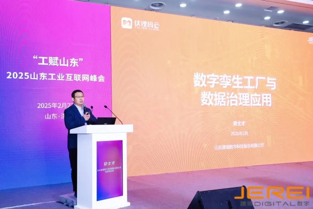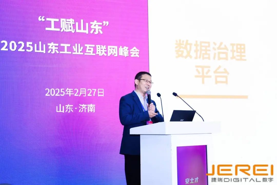 2025年2月27日-3月2日,“工賦山東”2025山東工業互聯網峰會暨工業互聯網創新成果展(以下簡稱:峰會)在濟南市山東國際會展中心M層8號會議室成功召開。本次峰會聚焦企業數字化轉型與人工智能應用,探尋工業互聯網在新時代背景下的創新發展路徑,為山東制造業的數字化轉型升級注入新的智慧與力量。捷瑞數字受邀參加,高級副總裁安士才先生發表《數字孿生工廠與數據治理應用》主題演講,詳細分享了捷瑞數字在數字化轉型領域的優秀解決方案及成果,為在場企業提供經驗與借鑒。