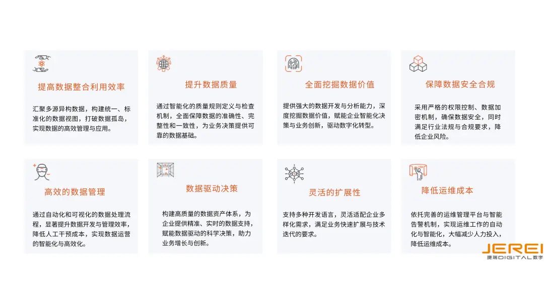捷瑞數字數據倉庫與數據治理平臺是企業數據管理的兩大核心工具,聚焦業務全流程,全面規范數據資產管理,深入挖掘和釋放數據價值,降低數據獲取時間,提升經營分析效率,提高業務響應速度,提升企業的市場洞察和數字化決策能力;更可以使企業略目標具體化、可衡量,并對執行效果進行全面監測,推動戰略目標落地,持續創新和發展奠定堅實基礎,助力企業進行數字化轉型。
