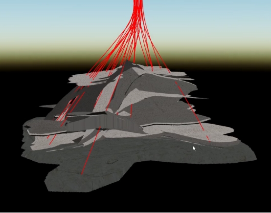 地質體建?;趩尉疁y井數據識別巖層類型,對比鄰井地質展布、孔隙度、導電率等參數繪制二維地質平面,結合半方差算法(分析巖性參數空間相關性)拓展為三維地質體,精準反映地層構造、流體分布及滲透率等關鍵參數。例如,析巖井下孿生平臺通過井口 GPS 定位與井斜數據構建三維井眼軌跡,結合地質素材庫繪制層位軌跡,實現層間互聯與區(qū)塊地質展布的可視化。